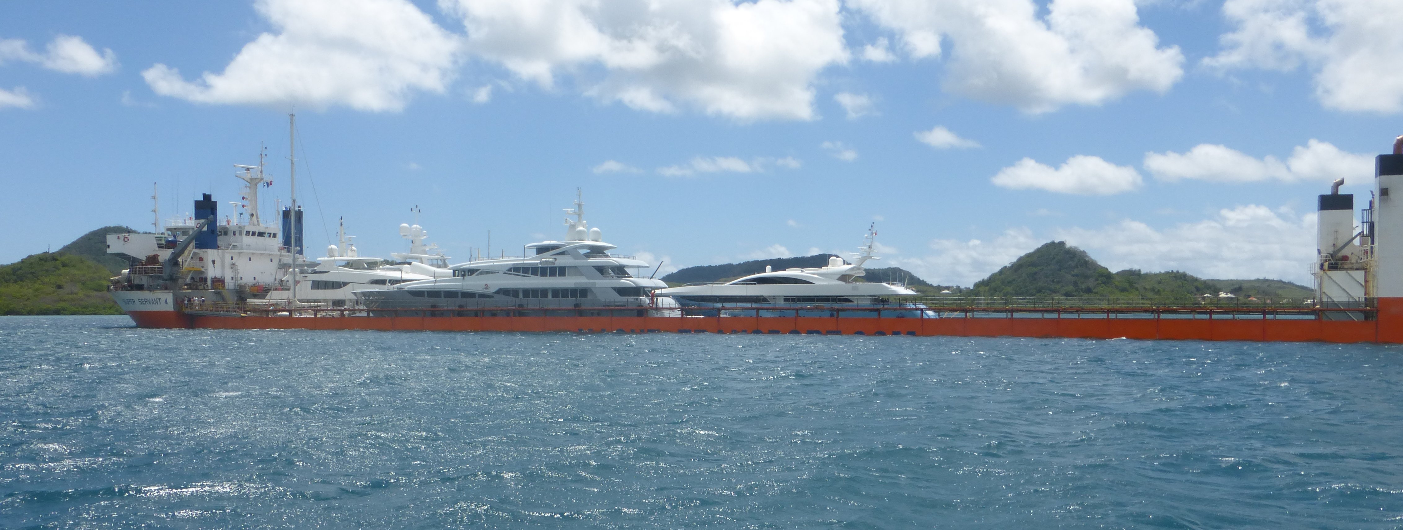 Thinking of lights, I want to tell you about a cruise ship which passed the other night, when I was sailing from Trinidad towards Martinique. (Cruise ships are forever scurrying back and forth overnight, ensuring their passengers reach the next Caribbean port-of-call around breakfast time.) This particular one, “Celebrity Summit”, on its way to Barbados, about two o’clock in the morning, was going to pass a mile or so away and I’d not have been concerned except it seemed to be flashing search lights at the sea and sky (and me). I called them on the radio to ask if there was a problem….”No problem, sir; they are having a party.” I gather it was a laser light display, stabbing bright coloured beams into the sky and everywhere else, presumably while night-owl passengers bopped away on the outside top deck. It does add variety to the night watch to have such incidents. But Nelson would have turned in his grave.