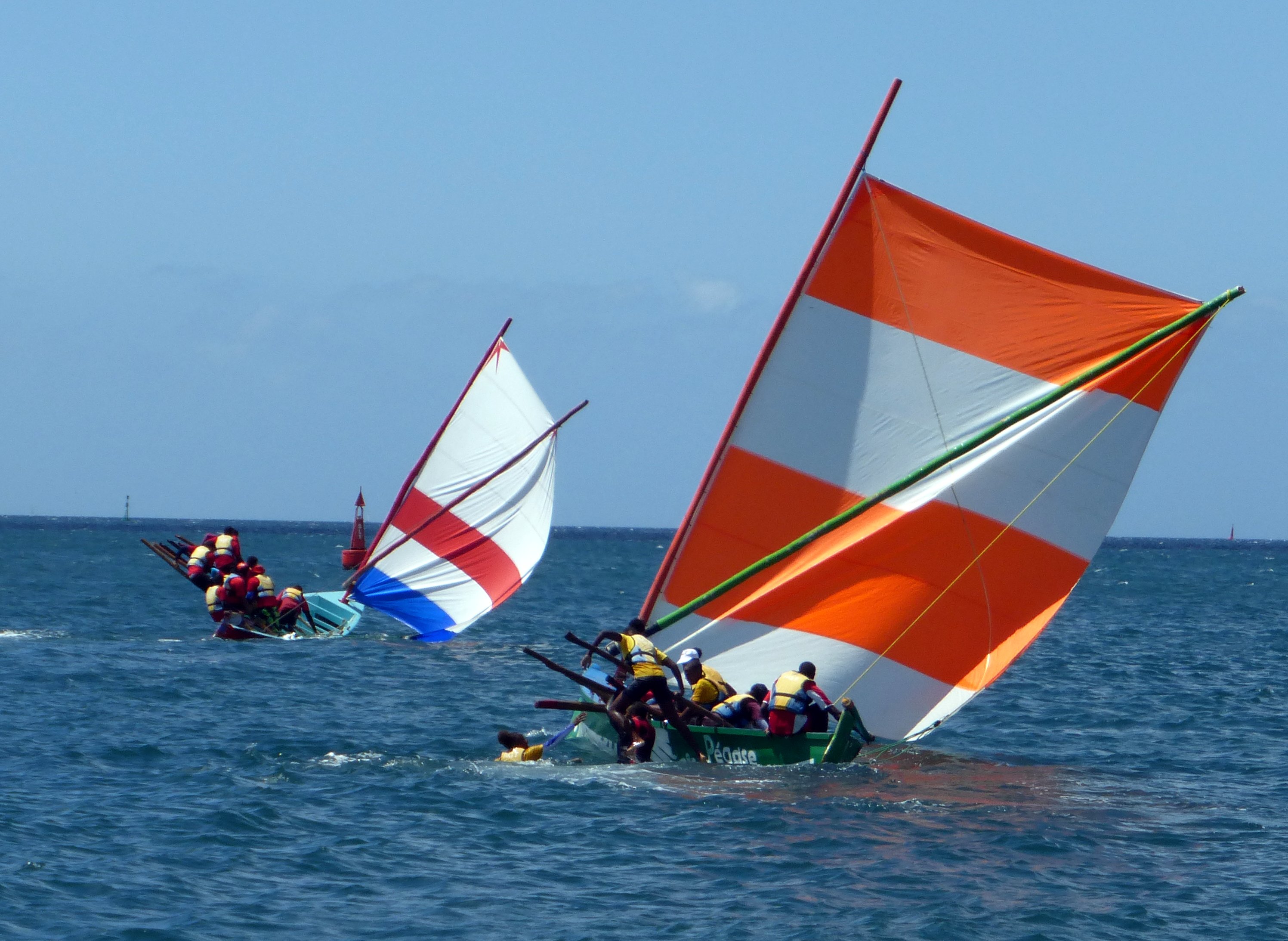 Here are some pictures of local sailing racing off Fort de France (Martinique’s capital). It’s clearly a dramatic business with crew leaping in and out on loglike ‘sliding’ seats, frequent capsizes etc. We had our hearts in our mouths as they raced through our anchorage.